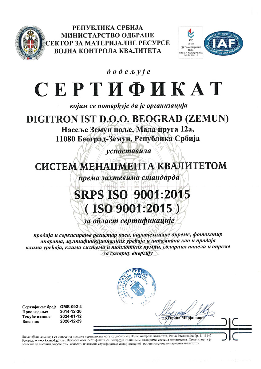Privredno društvo “Digitron ist” d.o.o. Beograd je 12.01.2024. god. od strane “Republika Srbija Ministarstvo odbrane, sector za materijalne resurse VKK” Beograd, Srbija, sertifikovalo sistem menadžmenta kvalitetom (QMS), u skladu sa zahtevima standarda ISO 9001:2015, sve u cilju podizanja nivoa kontrole kvaliteta proizvoda i usluga iz sopstvenog delokruga rada. Time se uspešno krenulo sa aktivnostima na primeni i unapređenju sistema menadžmenta kvalitetom, kao i na njegovoj integraciji sa ostalim standardima u okviru integrisanog sistema menadžmenta (IMS) u “Digitron ist-u”.