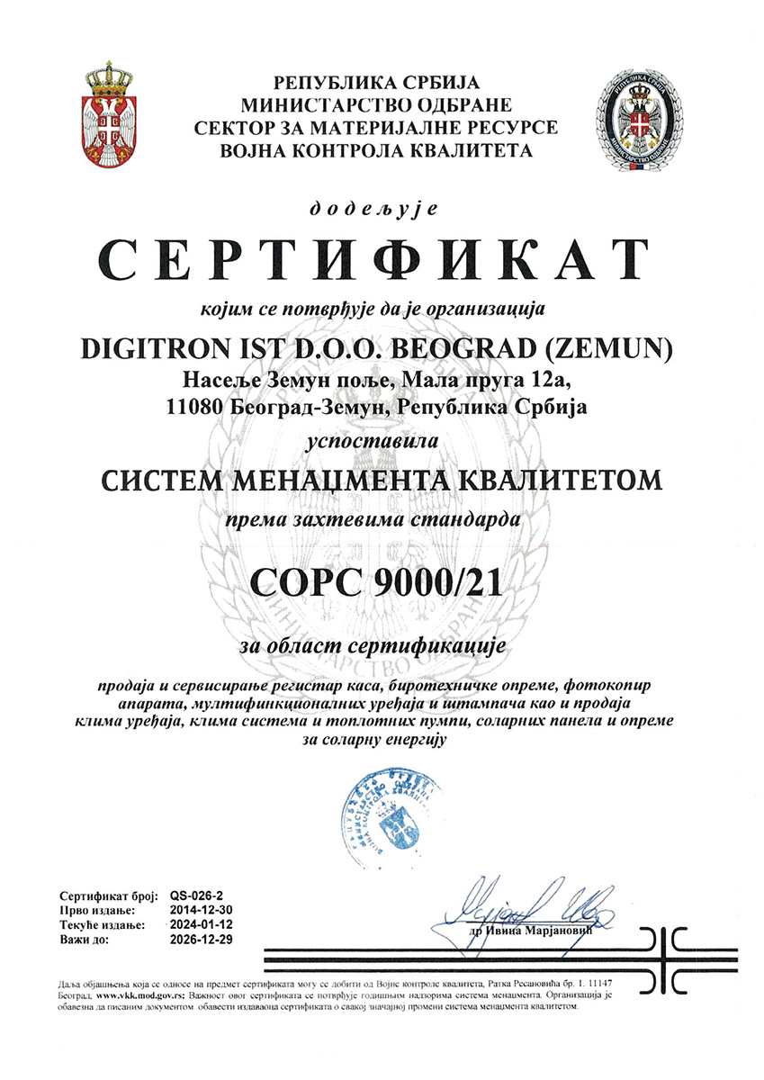 Privredno društvo “Digitron ist” d.o.o. Beograd je 12.01.2024. god. od strane “Republika Srbija Ministarstvo odbrane, sector za materijalne resurse VKK” Beograd, Srbija, sertifikovalo sistem upravljanja kvalitetom, u skladu sa zahtevima standarda COPC 9000/21.