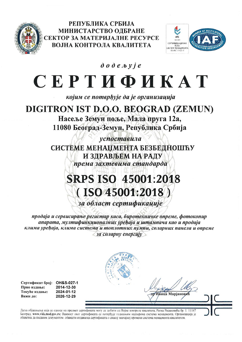 Privredno društvo “Digitron ist” d.o.o. Beograd je 12.01.2024. god. od strane “Republika Srbija Ministarstvo odbrane, sector za materijalne resurse VKK” Beograd, Srbija, sertifikovalo sistem menadžmenta bezbednošću i zdravljem na radu (ISO 45000:2018), prema zahtevima standarda SRPS ISO 45001:2018.